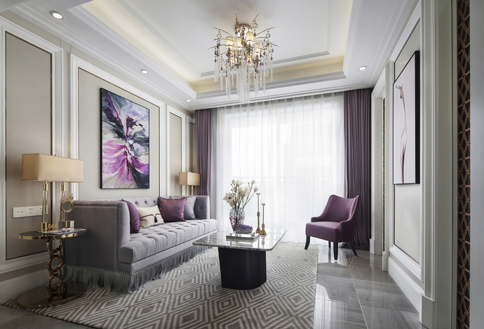 设计以霜灰色的素雅糅合紫色的浓郁,空间在低调优雅的灰白基底包围之下,用紫色温婉装点,弥漫一室浪漫情韵,形成法式的优雅气韵,犹如柔光下轻扬起的一曲华尔兹,滑步旋转间,绽放出居室旖旎浪漫的情绪。